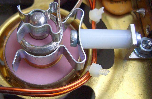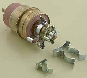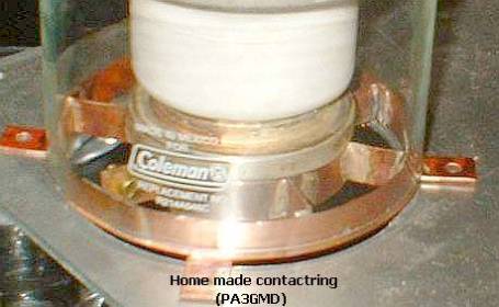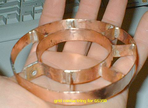 Buisvoeten voor deze GI-7B's zijn schaars en zelden beschikbaar via de handel. Zelf had ik het geluk om alleen messing contact ringen voor de roosteraansluiting te kunnen bemachtigen via een bod op internet. Dit model is een reserve onderdeel afkomstig van defensievoorraden uit voormalige Oostbloklanden. Soms worden deze ringen nog wel op www.eBay.de aangeboden. PA3GMD heeft een goed alternatief bedacht door van messing of koperplaat stroken te knippen en die met zilver soldeer op zodanige wijze samen te stellen, dat er een mooie contactring ontstaat. Je moet er maar opkomen! Hiernaast (fig») ziet u hoe hij dat ook gedaan heeft voor een keramische triode GS-35B.