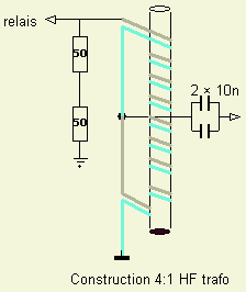 Als naar 25 Ω afgerond wordt dan kan een 1 ÷ 4 transformator aan de ingang de "impedantie" omhoog brengen naar 4 × 25 Ω = 100 Ω. Met een 100 Ω weerstand parallel wordt de ingang ongeveer 50 Ω. In de praktijk kan dat tegenvallen, want een goede breedband HF trafo van 1 ÷ 4 is niet zo maar te maken. Als u een 9.5 mm dikke ferrietstaaf uit een oude AM radio («fig) volgens de tekening wikkelt met 1.5–1.8 mm draad van een transformator dan zit u redelijk goed. Een staaf van ongeveer 5 cm lengte is al voldoende maar langer is nog beter. U maakt daarmee een bifilaire spoel van minstens 9 dicht tegen elkaar aan liggende windingen. Een boor van 9.5 mm als wikkelvorm gebruiken en vervolgens de spoel voorzichtig over de staaf schuiven. De binnenste draadeinden aan elkaar solderen: dat is het punt waar alle verbindingen met de kathodes bij elkaar komen.