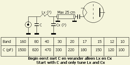 Als u ingangscircuits wilt aanbrengen kunt u dat beter en veiliger buiten de kast afregelen. Zo'n pi filter is te testen door het met een stukje coaxkabel (max. 25 cm) te verbinden met de ingang van de buis. Het inbouwen van de filters doet u daarna samen met dat coax kabeltje. De capaciteit van de kabel maakt deel uit van Cx. Als u het op een andere manier doet, bestaat er grote kans dat na het inbouwen op de hogere banden de SWR niet goed meer is. Dan gaat u ter plekke en vlakbij de hoogspanning toch aan de gang om dat omlaag te brengen. Start in elke band met een vaste ingangscondensator C volgens de tabel en speel dan met Lx en Cx om een zo laag mogelijke SWR te verkrijgen. Als het niet lukt om SWR = 1 te bereiken wijzig dan in geringe matig C en ga daarna weer verder met Lx en Cx. Elke verandering van het uitgangsfilter in de anode veroorzaakt ook een wijziging van de SWR aan de ingang. Daarom moet U de SWR aan de ingang altijd afregelen bij maximum uitgangsvermogen (in CW mode key down) en de versterker belasten met een geschikte 50 Ω dummy load.
