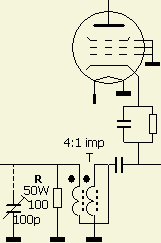 Indien men stuurvermogen over heeft, kan dit effect eveneens bereikt worden door de ingang extra te belasten met een verzwakker of een ander breedband systeem. Hier kan dat met aanpassing door een 4 ÷ 1 trafo. Deze transformeert («fig) de impedantie van de kathodes omhoog naar ongeveer 100 Ω en samen met een parallel geschakelde 100 Ω/50 W reflectievrije weerstand (dymmy load) wordt een transceiver breedbandig belast met een SGV < 1.5. Vrijwel alle sets met een transistor eindtrap zijn dan in staat om zonder afstemeenheid (tuner) het volle vermogen te leveren. Met een 100 pF trimmer is de 10 m-band optimaal af te regelen op minimale SWR. Het resultaat op deze band is afhankelijk van de bedrading en de opstelling der componenten. Het afregelen van in- en uitgangscircuits moet men altijd doen met vol draaggolf vermogen (key-down) en bij maximaal uitgangsvermogen en minimale ingangs SWR.