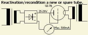 Ter voorkoming van vonkoverslag in een nieuwe of lange tijd niet gebruikte buis, is het verstandig om hem voor te bereiden (reactiveren) op zijn taak. Daar zijn diverse meningen over en oplossingen voor. Bij een GI-7B kan dat betrekkelijk eenvoudig. Met een gelijkspanning van 25 à 28 V heeft men voldoende om de buis 500 mA te laten trekken als het rooster met de anode verbonden wordt. Laat de buis eerst een half uur aanstaan met alléén 12.6 V op de gloeidraad. Daarna komt de "hoogspanning" van ongeveer 25 V erop en regelt men dat af op een anodestroom van 500 mA. Het mooiste is als men de beschikking heeft over een stroombegrenzer, want tijdens het reactiveren kan de stroom onverwachts toenemen, zodat een bewaking nodig blijft om die 500 mA te handhaven. Meestal laat ik het reactiveren niet langer duren dan een uur of zo. U heeft gauw genoeg in de gaten bij welke spanning een goede buis die stroom laat lopen, zodat u een indicatie heeft of een andere buis wel of niet beter is.