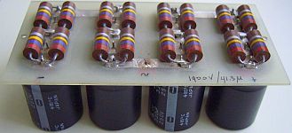 With a doubling or quadrupling circuit (fig»), adequate high voltage can be delivered. Series-connected modern electrolytic with large capacity and high voltage (e.g. 470 μF/400 V) will give adequate smoothing and regulation during modulation peaks. They should be individually bridged by an equalising resistance of 100 kΩ (2 W). For safety reasons and adequate cooling, it is better to have two 220 kΩ or three 330 kΩ resistors in parallel instead of one of 100 kΩ.