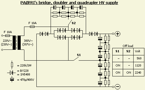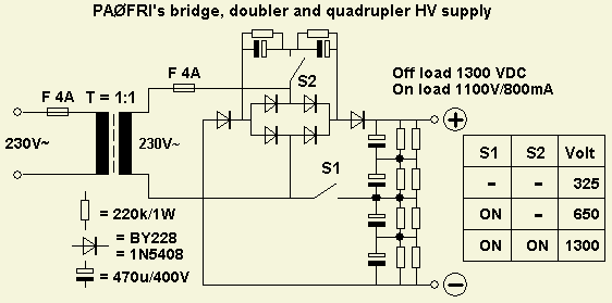 If you don't like the feature of adjusting with lowered voltage (soft-start, which prevents problems), the switches may be left out and the appropriate connections be made. The average voltage after quadrupling will be around 1150 V during SSB-transmission and around 1000 V with a constant carrier.