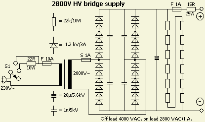 Ook met een 220 ÷ 380 V transformator is een behoorlijke voeding te maken. Houdt er wel rekening mee dat met ons huidige elektriciteitsnet (± 228V~) er aan de secundaire kant een hogere spanning gegenereerd wordt. Bij mijn experimentele voeding op het plankje werd een 380 ÷ 220 V trafo ingezet. Als zoiets gebruikt wordt voor een 220 ÷ 380 V transformatie, ontstaat er aan de secundaire kant een lagere spanning dan 380 V. Bij volle belasting werd aan de secundaire kant een spanning van 2 kV gemeten.
