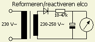 Van nieuwe en een lange tijd niet gebruikte condensatoren moet het elektrolyt gereformeerd worden. Sluit een losse elco via een 10 – 47 kW weerstand en HV diode (1N4007) aan op ongeveer 250 V~. Meet met een digitale voltmeter de gelijkspanning over de condensator en als dat niet meer stijgt is er voldoende gereformeerd. Ontlaadt de condensator met een 220 ? weerstand! Herhaal eventueel deze procedure een paar keer.