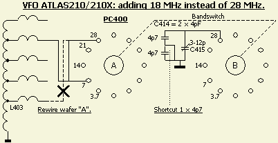 A test showed that the conversion was not difficult. Disconnect the 28 MHz wire of VFO's wafer A to L403 and rewire to 7 MHz contact lug of wafer A. In my set 2 × 4.7 pF (C414) are connected in series at waver B on 28 MHz. Shortcut one so that only 4.7 pF is in parallel to C415. With this modification trimmer C415 can adjust for 18.000 MHz corresponding to zero at the beginning of the scale.
