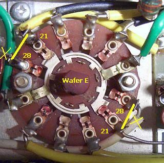 The (LPF) is hidden in the Alu box with the heatsink. If that is removed you have access to wafer E of the band switch. For the 17 m band one may modify 10 m LPF, but that is a chore. We simply use 15 m LPF for 17 m. At wafer E (fig») disconnect wires to 10 m LPF and rewire to 15 m LPF. Finally solder wire ends across 10 m and 15 m contact lugs.