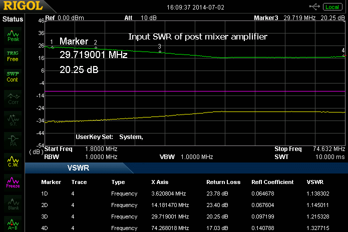6-jul-2014. Met een derde eenvoudiger ontwerp van een "post mixer amplifier" met SWR beeld op spectrum analysator en foto print.