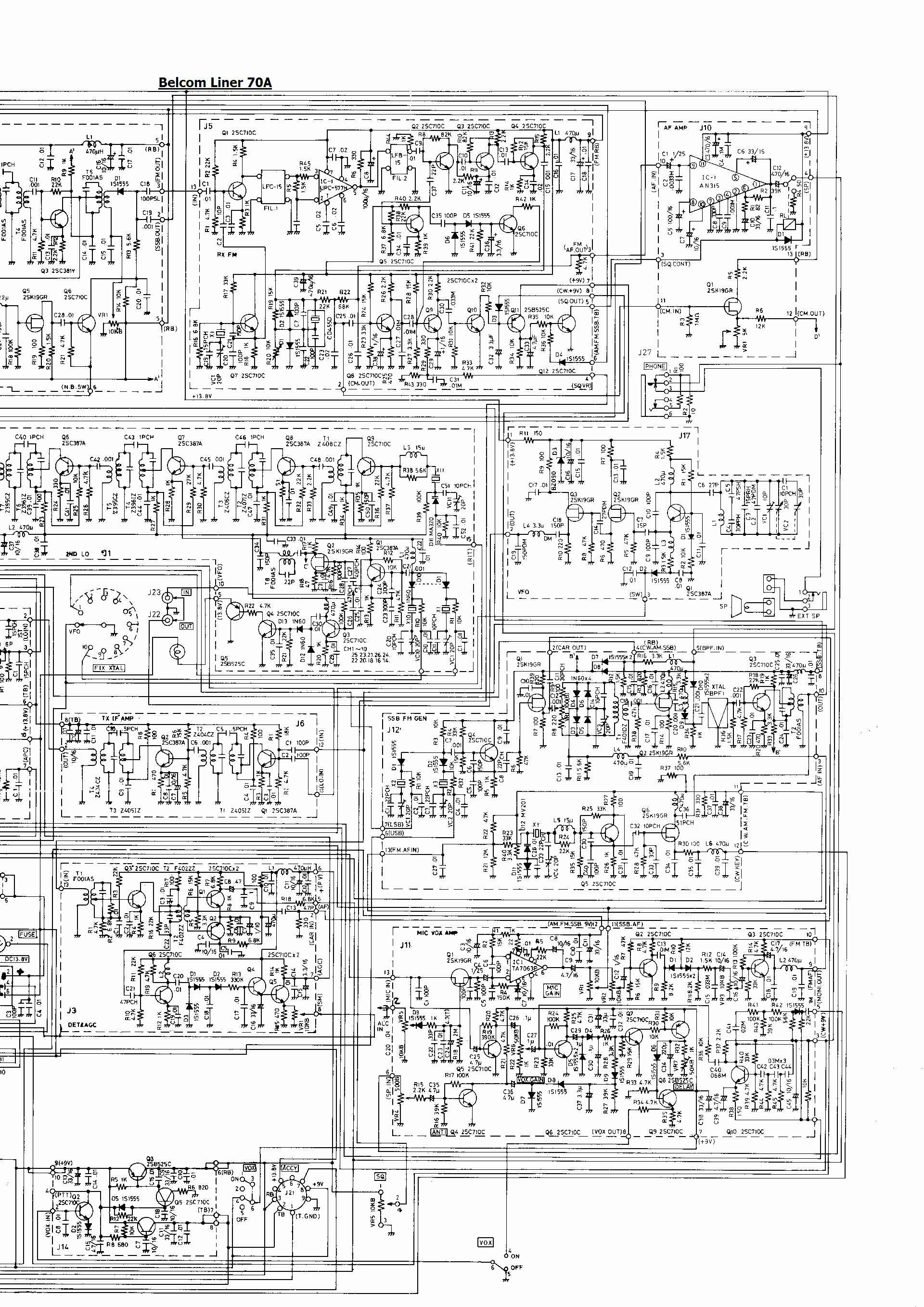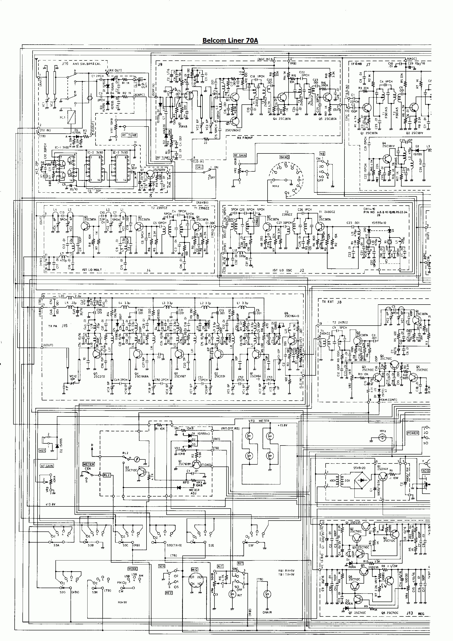 Een kennis gaf mij een inwendig enigszins verweerde en incomplete Belcom Liner 70A en zei erbij: "misschien kan je er iets mee doen want een gedeelte doet het nog". De eindtrap, interne voeding en het uitgangsfilter waren verwijderd. De frontplaat met knoppen en meter was vuil maar verder onbeschadigd en in goed staat. Alleen het onderste deel van de kast ontbrak. Verder kreeg ik een handleiding in het Japans en een schema dat bijna uit elkaar viel. Dat laatste was meegenomen want van dit setje is maar weinig informatie op internet te vinden. Alleen wat onduidelijke schema's en een in het Engels vertaalde weergave van de Japanse tekst. De degelijkheid van het nogal zware apparaat van 11.5 kg trof mij, evenals de mechanische uitvoering van bij voorbeeld de aandrijving van de afstemschaal. Dergelijke mechanisch sterke en service vriendelijke sets zijn tegenwoordig een uitzondering.