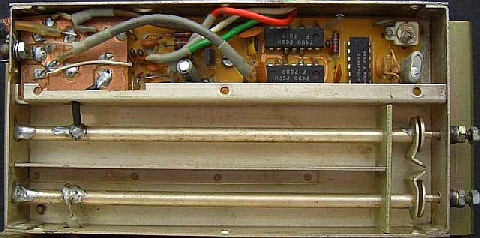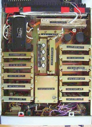 Een paar dagen later werd de set voor een test in de SSB mode uitgestuurd met een 1750 Hz toon. De output was minder dan in de FM mode. Dus weer het deksel eraf en toen was de output in beide modes gelijk! Dus toch nog HF terugwerking. Een poos ben ik aan de gang geweest met het verplaatsen van het deksel of een kleinere metalen plaat over de modules om een HF koppeling vast te stellen. Opeens zag ik door een bepaalde lichtinval dat er kennelijk een strip was geweest tussen twee modules. Op de bovenste foto is dat nu duidelijk te zien, maar tijdens het fout zoeken was het niet opgevallen ook omdat in mijn sloopzet beide modules ontbraken. De terugwerking verdween met het aanbrengen van een strip in de vorm van een stukje afscherming. Overigens de "ligging" van de coaxkabel op de TX PA UNIT heeft ook nog invloed op output en het beteugelen van de terugwerking.