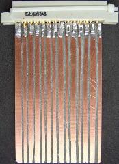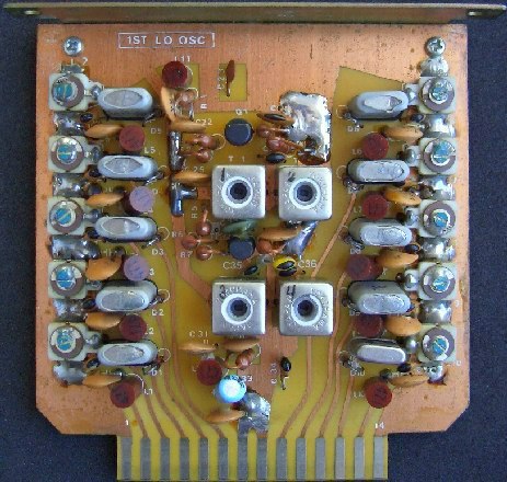 Het probleem zat hoofdzakelijk in de (fig») 1ST LO OSC UNIT. Hier zijn 10 kristal oscillators die verderop in het apparaat na 12 maal vermenigvuldigen en mengen voor 10 bandsegmenten van 1 MHz zorgen. Door veroudering van de componenten willen veel schakelingen niet oscilleren. Door nu de desbetreffende trimmer opnieuw in te stellen, start een oscillator en kan dan op frequentie gebracht worden. Helaas zal men voor de insteek modules zelf twee "extender boards" moeten maken om de componenten op de print te kunnen bereiken en te bedienen. Dat was voor mij niet onoverkomelijk want de benodigde voetjes voor de printen werden uit de sloopset gehaald. Nodig zijn een board met een enkelzijdig spoor en een board met een dubbelzijdig spoor. De spoorbreedte is in een mm raster dat gelijk blijkt te zijn als dat voor een Atlas 210x of 215x transceiver.