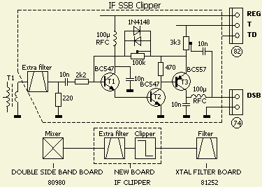 Een van de methodes om het gemiddelde vermogen van een zender te verhogen is het begrenzen van een HF signaal. Dat kan met een enkelzijband (SSB) of met een dubbelzijband (DSB) signaal en beide systemen zijn even effectief. Hier werd voor DSB gekozen om een tweede filter uit te sparen. Het DSB (IF) signaal van de modulator wordt in een differentiaal schakeling met twee transistors begrensd. Er ontstaan intermodulatie producten en het smalle SSB filter op het XTAL FILTER BOARD (81252) voorkomt het uitzenden van een breed spectrum. Er is iets meer HF vervorming dan met een geclipt SSB signaal, maar met een gematigde microfoon versterking is daar niets van te horen terwijl de gemiddelde output behoorlijk toeneemt. Eventueel kan men met R26 of de extra 1 k? basisweerstand het signaal aan de uitgang regelen voor een juist niveau voor het kristalfilter. De in het schema getoonde waarden bleken hier goed te voldoen.