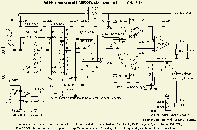 Een meer uitgebreide beschrijving staat hier en met een lichte aanpassing kan de print (fig») van Carel, PAØCMU voor dit ontwerp gebruikt worden. Er werd een gaatje in het huis van de PTO geboord als doorvoer voor de spanning die van de stabilisator komt. In het PTO compartiment werden 22 nF, 10 pF, 100 k? en een varicap diode BB521 gemonteerd. De extra varicap komt in feite parallel aan de varicap van de OFFSET (RIT Control) en dat beperkt het regelbereik van de OFFSET tot ongeveer 3 kHz en 800 Hz. In het praktische gebruik is dat naar mijn ervaring geen echt ongemak. Een coaxkabel verbindt de uitgang van de PTO met de ingang van de stabilisator. Als er veel aan de afstemknop gedraaid wordt kan de stabilisator buiten zijn regelbereik komen en dan is een reset nodig om de uitgangspanning weer midden in zijn bereik te krijgen. Om een extra knop aan de frontplaat te vermijden werd een relais bij de stabilisator geplaatst dat bediend wordt door de SPOT drukknop op de frontplaat. De SPOT eigenschap blijft gehandhaafd. In alle schema's van de Corsair is de SPOT bedrading moeilijk te traceren maar als een draad van de knop aan de frontplaat naar aansluiting 05 van de DOUBLE SIDE BAND BOARD (80980) aangelegd wordt, werkt de reset door op de SPOT knop te drukken.