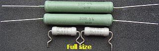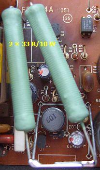 Instead of two small resistors a pair of 33 W Ω/10 types (fig») with long wire ends is used. This produces a reduced thermal conductivity onto the PCB and a better functioning of the cooling. To install the longer resistors above the PCB a jumper was removed and replaced by a "U" shaped jumper as support and contact pin.