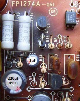 Note: the value of all components drawn in the schematic was originally installed on my PCB FP1274A-051. To be safe I removed Q4 (2SC3536) and mounted a BUV48A. Details of schematics published on Internet can be different. G8JACI replaced Q4 with a 2SC4429, which is rated at 1100 V/8 A, 60W and have the same pin configuration as the original, it works fine. These are easily available in the UK.
