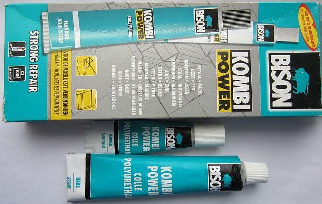 De lijm was het type KOMBI POWER van BISON. Dat is een zeer sterke lijmsoort dat ook bestand is tegen minstens 100°C. Jaren geleden heb ik een defect kunststof deksel voor het onthardingszout in een afwasmachine met deze lijm gerepareerd.