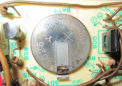 Backup batterij CR-2025 zal na verloop van tijd vervangen moeten worden. In mijn woonplaats is het originele type met soldeerlippen niet te verkrijgen, wel een meer gangbare en grotere fotobatterij CR-123. Om zo weinig mogelijk aan de printsporen te solderen, werden met een Dremel slijpschijf de aansluitingen van de knoopcel doorgeslepen. De overgebleven opstaande lippen zijn dan geschikt om met twee verlengdraden de fotobatterij aan te sluiten. Er is plaats onder de CPU UNIT en met twee kabelbinders kan het stevig aan een verticale steun vastgemaakt worden.