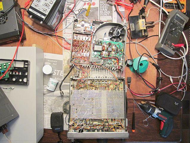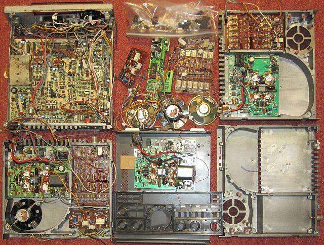 In het verleden had ik twee gedeeltelijk defecte eindtrappen van iemand overgenomen, voornamelijk om de power transistors als reserve voor iets anders te hebben. Het spul lag al jaren ongebruikt in mijn junkbox. Onlangs kreeg ik uit een nalatenschap twee gestripte FT-757GX transceivers met de vraag: "Heb je er iets aan en kan je er wat mee, anders verdwijnt het in de afvalcontainer". Beide sets waren aan boord van een schip overspoeld met zeewater en daardoor behoorlijk aangetast, daarna uit elkaar gehaald en ontdaan van diverse knoppen en componenten. Verder waren van veel stekkerverbindingen de draden doorgeknipt. Printen met hun componenten zagen er wat smoezelig uit, maar bleken na een schoonmaakbeurt grotendeels in goede staat te zijn. Normaal gesproken doe ik met apparaten in een dergelijke toestand niets en wordt het alleen bewaard voor reserve onderdelen. Omdat ik nog niet te maken heb gehad met een FT-757GX, werd uit nieuwschierigheid toch een poging gedaan om van het schroot iets te maken. Na veel "passen en meten" is het ten slotte gelukt om een goed werkende transceiver in elkaar te sleutelen. De overblijfselen (fig») worden bewaard als "spare parts", want je weet maar nooit!