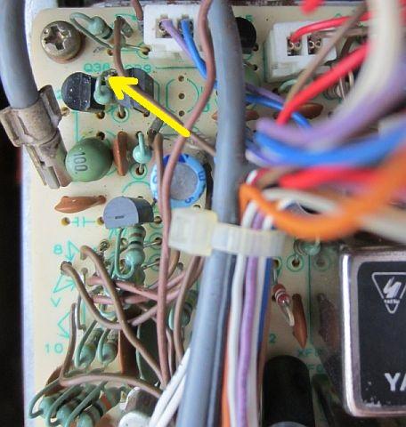 Van PNP transistor Q03 (2SA733AQ) linksboven was een poot afgebroken, zodat reparatie vrijwel onmogelijk was. Een BC557 bleek een goede vervanger te zijn. De aansluitingen zijn anders dan van de originele transistor!