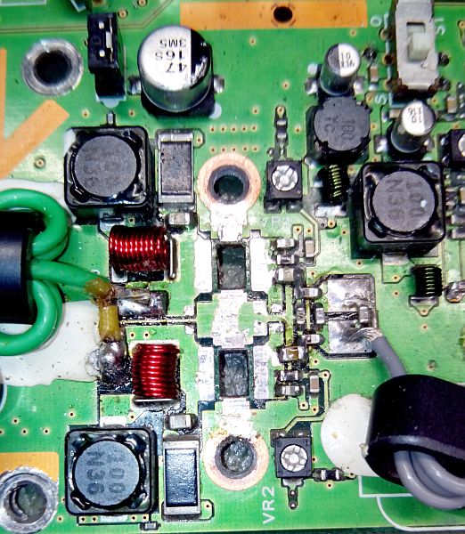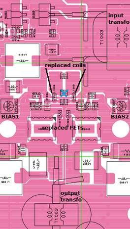 While soldering all around the input circuit of the FET’s I noticed that one of the SMD coils (coil L1009 in the schematic) had a “loose end”. It looked ok, but when I soldered it at one side, the complete coil came loose. Aha, the problem with the intermittent power loss is found. I ordered 10 new coils from Farnell (order code 1669603; 2,7 nH; 0603 size). Lucky me that I had to order them with a minimum of 10 pieces, The first coil I replaced fell apart. These coils are very fragile, so I carefully replaced both coil L1008 and L1009 with a new one and checked everything with my ohm meter. Everything makes good contact now.