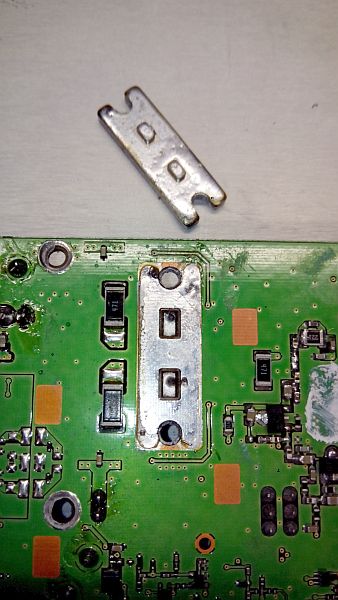 To put back the RD07MVS1 FETs, I simply placed them on the board with a fine pincet, and soldered all sides to the PCB. Now I turned the PCB upside down, put a little tin on the bottom of the FETs, and placed the cooling block on its place. As you will notice, because of the extra tin applied to the bottom of the FETs, this cooling block is not touching the bottom of the PCB. This is OK! Now heat up the cooling block again with the hot air blower. You will find that at some point, the block “drops” a bit, confirming that the extra tin on the bottom of the FETs has melted. Make sure that the holes of the cooling block are aligned with the holes in the PCB.