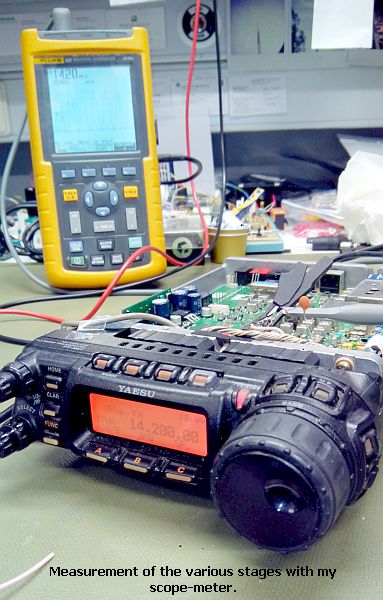 The problem is now definitely located in the exciter stage. I searched the web about this problem, and found various problems, in not only the FT-857, but also the FT-897, which is actually the same radio, and also the FT-817, who has the same FETs to make it’s 5W RF output. I also learned that I now was a member of the “blown finals club”. Yay ! But in my search on how to fix this problem, I did not come up with much useful information. My best option was to go the FT-817 way of fixing : buy a new final board, with the complete amplifier on it, and try to merge it somewhat into the FT-857.