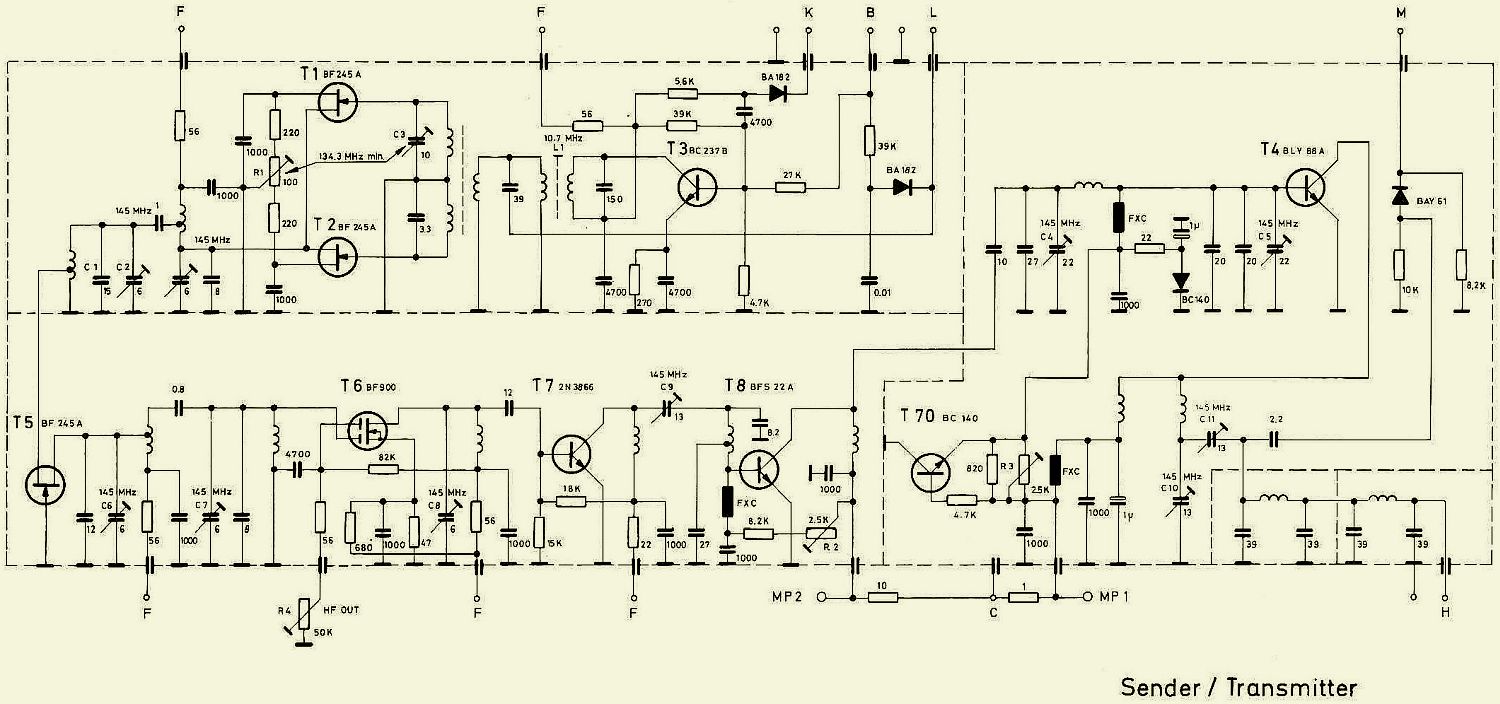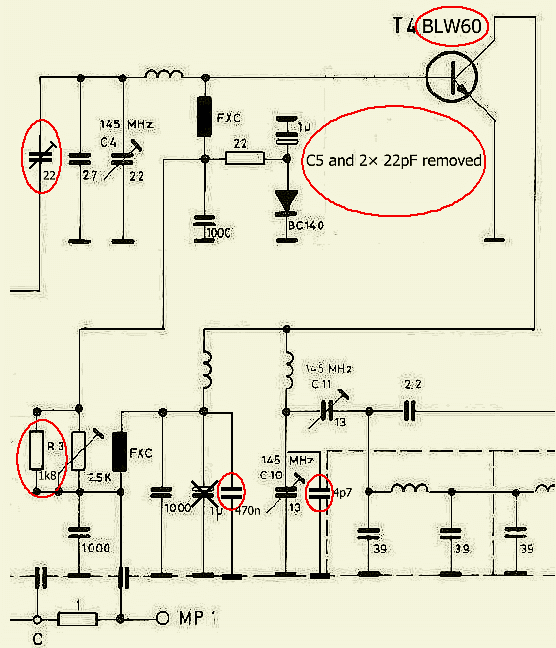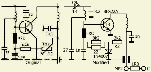 Om enig output te verkrijgen moesten C5 en 2 × 22 pF aan de basis verwijderd worden. Verder werd voor een nauwkeuriger afregeling de 10 pF koppelcondensator van de stuurtrap naar de eindtrap vervangen door een 22 pF trimmer.