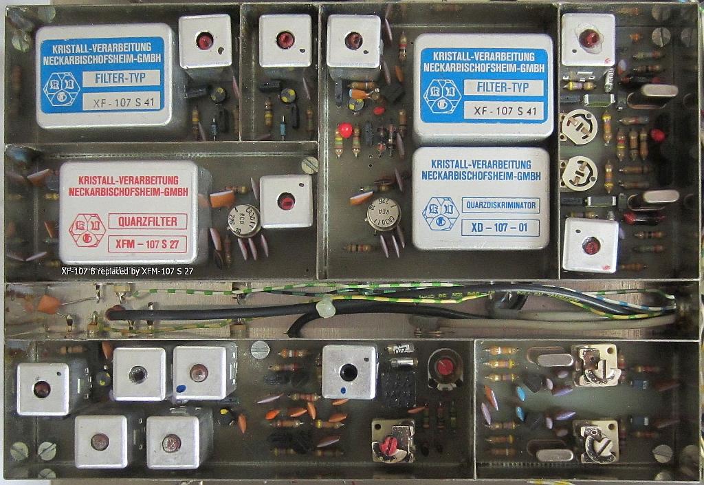 Via eBay werd een KVG XFM-107 S 27 filter van 10.7 MHz aangeschaft. Dit filter is ongeveer 15 kHz breed, maar is symmetrischer geconstrueerd dan het originele XF-9B filter. Daarom past het beter in het 12.5 kHz kanaal raster en dat is in de praktijk ook te merken. Zonder andere veranderingen is het oude fiter verwijderd en het nieuwe gemonteerd.