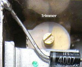 Deze instelling verbeterde het stuurvermogen en om dat de vergroten werd de 10 Ohm weerstand van punt C naar MP2 vervangen door een 1 Ohm weerstand. In het schema en de foto hiernaast is te zien hoe twee weerstanden en één diode gemonteerd werden en verder een trimmer op de plaats van een 10 pF condensator. De 1N4007 is met koelpasta tegen het L-profiel koelblok gemonteerd om de opwarming van T8 te volgen. Eigenlijk is dat niet nodig omdat het koellichaam de BFS22A behoorlijk op een stabiele temperatuur houdt.