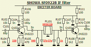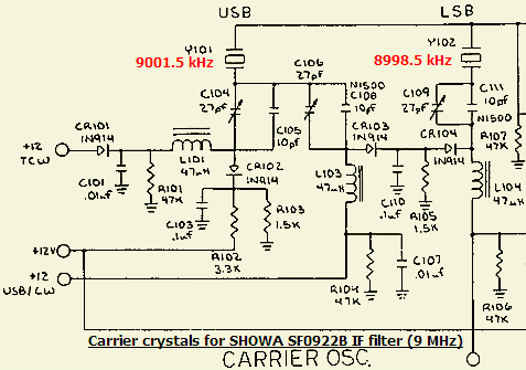Hoewel het waarschijnlijk mogelijk is om met extra capaciteiten parallel aan (fig») C105 en C111 de originele kristallen 9000.0 kHz en 9003.3 kHz omlaag te trekken, werden zij vervangen door 8998.5 kHz en 9001.5 kHz afkomstig uit een YAESU FT200. Met de trimmers C104, C109 en C108 zijn de correcte frequenties in te stellen.