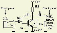 Volgens de manual heeft de microfoon aansluiting (J101) een impedantie van 25 kΩ. Dat was in de vorige eeuw goed geschikt voor een gemiddelde microfoon van ongeveer 50 kΩ. Tegenwoordig is 200–600 Ω een meer gebruikelijke waarde en dan geeft zo'n type te weinig signaal af aan de set.