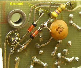 Desoldeer de binnenader van de (dunne) coaxkabel en monteer in het gat een 22–100 nF condensator. Dat is het punt P in het schema. Soldeer daarna de ader aan de andere kant van de condensator en monteer de rest van de componenten aan de sporenzijde, zie de eerste foto. Na deze operatie was de stabiliteit met een antenne eraan niet altijd evengoed en dat werd verholpen door een ferrietkraal over de binnenader aan het "begin" van de coaxkabel te schuiven. Men kan eventueel ook een snap-on ferriet ontstoorder op die plek over de kabel aanbrengen.