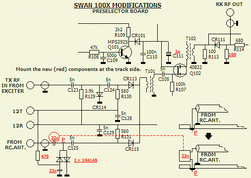 Bij sterke signalen in de 40 m band werd de ontvanger overstuurd. De extra 100 Ω weerstand bij het knooppunt van CR111 (BA244) en R114 (680 Ω) is een voorlopig experiment. Tijdens ontvangst vormt deze component samen met de geleidende diode CR111 en weerstand R113 (100 Ω) een verzwakker voor het signaal naar de diode ringmixer. Tevens ziet de mixer ingang dan een impedantie van ongeveer 50 Ω. Omdat ook de belasting in de drain van Q101 omlaag gaat, vermindert de versterking van de FET.