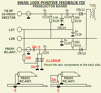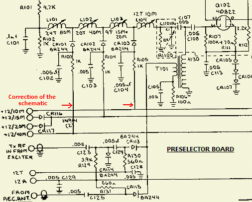 Omdat het verschijnsel zich alleen op 10 m voordeed, verdacht ik op de PRESELECTOR BOARD de (nul)capaciteit van CR115 (BA244) als boosdoener. Immers het signaal van het z/o-relais gaat via C125 en CR115 naar T101 dat zowel voor zenden als ontvangen in bedrijf is. Op T101 komt het stuursignaal en het lekkende zendsignaal in fase aan. Toen de desbetreffende coaxkabel los gemaakt werd, was de 10 m band stabiel met mooie kerstboompjes op een scoop.