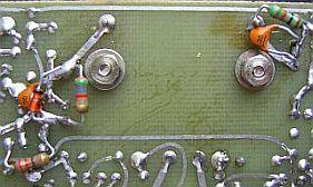 Aanvankelijk werd het filter gemonteerd zonder enige verandering aan het circuit. Omdat het een geringe moeite bleek te zijn, toch maar besloten om te belasten («fig) met een berekende impedantie zo dicht mogelijk bij 500 Ω. Vandaar de afwijkende componenten aan de in en uitgang. Wat al verwacht werd bleek te kloppen, de weerstanden veroorzaken verzwakking dat gecompenseerd werd door 220 Ω parallel aan R105 (470 Ω) te monteren. De nieuwe componenten kunnen zonder de print te beschadigen aan de sporenzijde gesoldeerd worden.