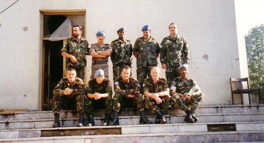 Achterste rij van links naar rechts: Spanjaard Joaquin Milaus del Bosch (kap), Portugees Jose Correia (kap), Colombiaan Carlos Forero (kap) en Kenianen Samson Kambuni (maj/lcdr) en Joseph Mwew (lkol). De tweede was zeer goed, mijn opvolger en later in eigen land generaal geworden. Voorste rij van links naar rechts: Deen Peder Pedersen (maj), twee Nederlanders Frits Geerligs (maj), Stan van Bragt (kap) en een Noor Stig Skinnerland (maj).