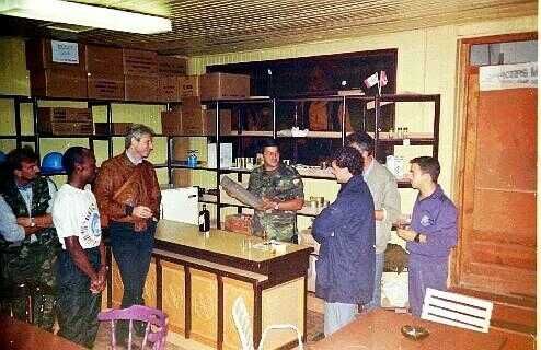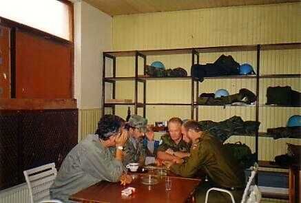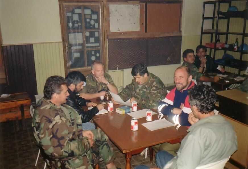 De gelagkamer diende als vergaderplaats maar ook als huiskamer en eetkamer. Vaak kwam de leiding van de Moslim brigade 's avonds binnen voor een "avondje uit". Onze voorraad blikjes bier en cola zal daar ook wel een rol bij gespeeld hebben. Boven een meeting met de brigadecommandant (bekijkt een document) en tegenover hem twee logistieke officieren van zijn staf. Rechts is hij later op de avond samen met een paar stafleden te gast en doet mee aan een spelletje kaarten met onze tolk (grijs jack) en kapitein Carlos (rechts) een UNMO uit Colombia. Links reikt Carlos ons cadeau uit aan een vertrekkende medewerker.