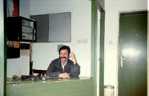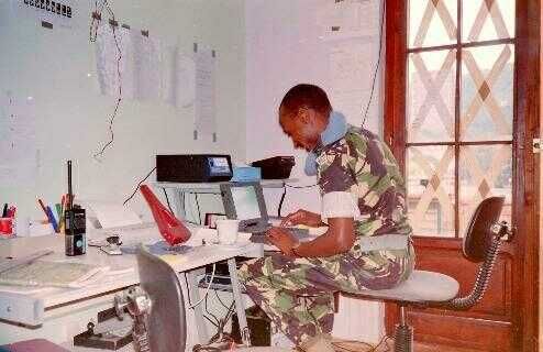 Dit (fig») was het eerste "office" in een slaapkamer met openslaande deuren naar het achterbalkon. "On duty" een verlegen lachende Keniaanse UNMO. De laptop was "geleend" van UNHCR. Dat zat zo. De vertegenwoordiger van UNHCR (een Fransman) in de enclave had geen radiocontact met zijn organisatie. Daarom werd er onverwachts een pakket afgeleverd met naar later bleek satelliet apparatuur met noodvoeding en laptop. Normaal gesproken wordt zoiets door hun techneuten geïnstalleerd, maar dat was gezien de spannende situatie niet mogelijk. Het pakket lag dus geruime tijd ongeopend op zijn kamer. Toen dat toevallig door mij opgemerkt werd, vertelde hij het hele verhaal. Omdat wij geen goede verbinding hadden met de rest van UNPROFOR, leek dit een unieke kans om over een beter systeem te beschikken. Nu bleek weer eens dat het handig is als je zendamateur bent met enige technische kennis. Ik stelde hem voor dat het systeem door mij opgezet en in ons bureau geïnstalleerd zou worden. De netspanning kwam dan van het aggregaat dat op het balkon stond. Verder kreeg hij onbeperkte toegang tot het office. Het voordeel was dat er permanent een dienstdoende officier aanwezig was om zijn inkomende berichten te ontvangen, te beoordelen en hem eventueel direct op de hoogte te stellen. Hij stemde in en zo geschiedde. Het kostte enige tijd om de apparatuur te bestuderen en begrijpen en de bijbehorende laptop aan de praat te krijgen. Toen de communicatie apparatuur werkte zou de UNHC'er met de laptop aan de gang gaan. De laaste was beveiligd met een wachtwoord, maar dat was niet met de zending meegekomenen en was ook niet te achterhalen bij de afzenders. Ook navragen hiep niet, het woord was kwijt geraakt. Wij beiden waren de enige aanwezigen met wat rudimentaire kennis van computers. Het was begin 1993 en ervaring met PC's was nog niet bij iedereen vanzelfsprekend of zelfs afwezig. Van alles geprobeerd met als eerste Gorazde, GORAZDE en daarna andere voor de hand liggende combinaties. Door onze beperkte ervaring zijn wij er dagenlang mee bezig geweest. Gelukkig kreeg de Fransman een spontane ingeving door "gorazde" met kleine letters te typen en zowaar het ding begon te leven!
