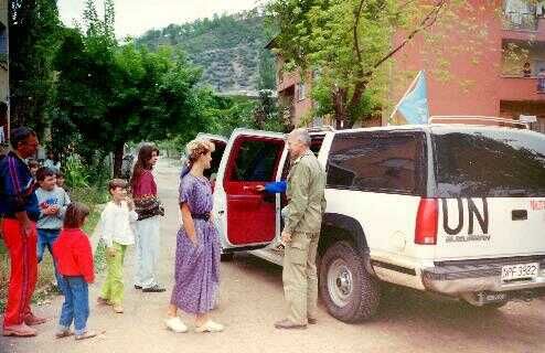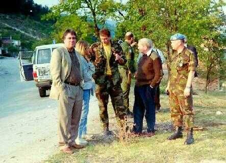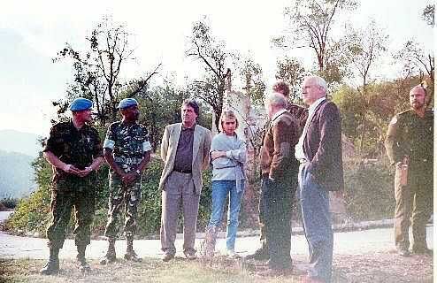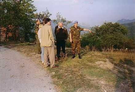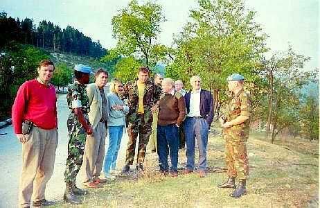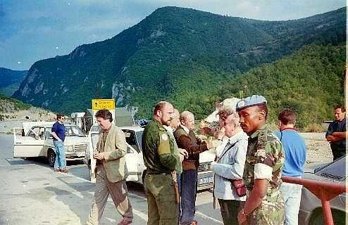 Tijdens een rustige periode bezocht een Engelse parlementaire delegatie de enclave om te beoordelen of de aanwezigheid van een Engels bataljon gewenst was. Links een escorte van Servische politie begeleidde de delegatie tot de grens. Rechts een eerste kennismaking met de delegatieleden.