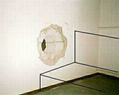 Er was geen foto direct na het gebeuren, maar later kon ik van het gat een opname zonder divan maken. De ingetekende figuur verduidelijkt de hachelijke situatie waarin hij verkeerd heeft.