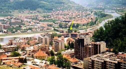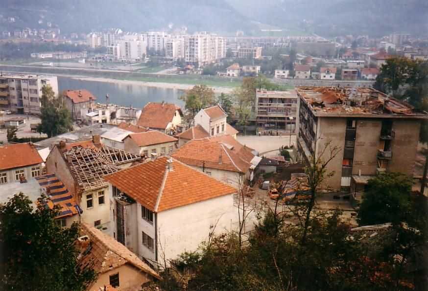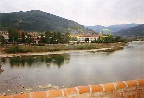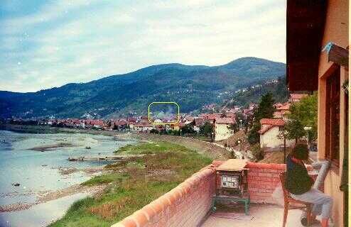 Uitzicht van ons balkon aan de achterkant van het onderkomen. Toen de andere partij nog de omringende heuvels en bergen in handen had, werd deze brug voortdurend beschoten door sluipschutters. Net zoals in Sarajevo vonden veel burgers daarbij de dood. Een Engelse parlementaire delegatie die een tijd later tijdens een "veilige" periode op bezoek kwam werd rondgeleid. Zij kwamen beoordelen of een Engels bataljon in de enclave geplaatst moest worden. Op de heuvel werd getoond van waar uit sluipschutters aanlegden op de brug. Overigens vielen tijdens het bezoek toch nog enige granaten, gelukkig niet waar de Engelsen rondgeleid werden. Kennelijk was dat bedoeld om te provoceren en imponeren. In een later stadium na mijn vertrek werd inderdaad een Engels bataljon in Gorazde gelegerd.