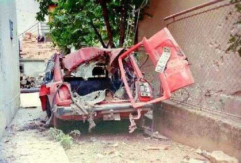 Dit (fig») blijft er over van een ongepantserd voertuig of auto als er op een tankmijn gereden wordt.