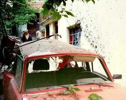 Een granaatinslag midden in het centrum van Gorazde ongeveer 50 m van de UNMO post. Een lokale cameraman filmt nog geen 5 minuten later het voertuig. Waarschijnlijk mij ook opgenomen, want ik sta voor de auto de foto te maken.
