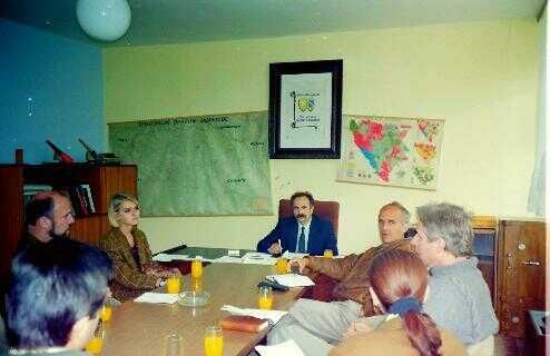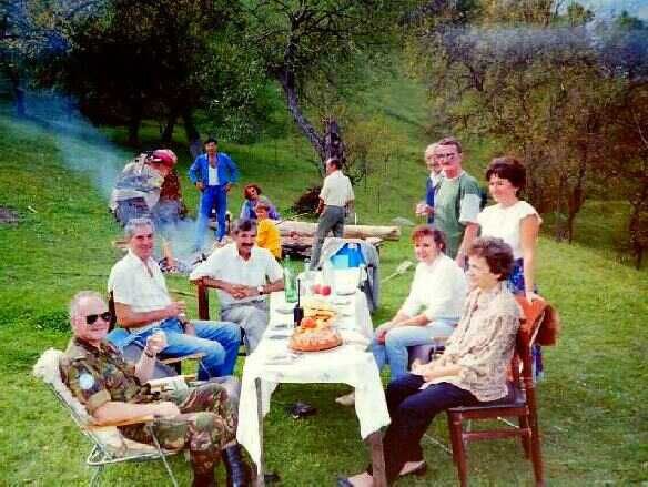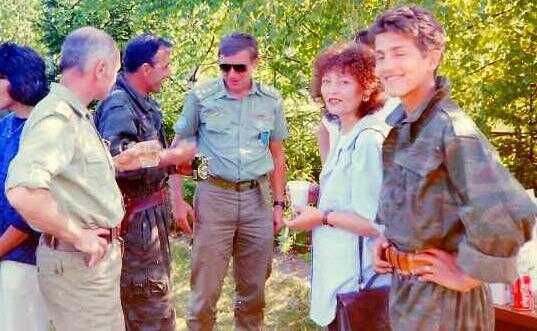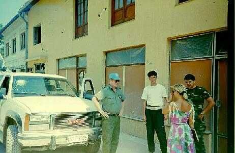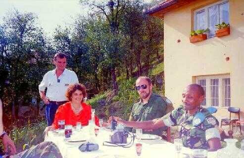 Deze («fig) meeting met een nieuwe Servische commandant (links) vond plaats in een redelijk net restaurant. Aanwezig waren onze tolk (fotograaf) hun vrouwelijke tolk, militairen, politie en twee UNMO's. Zoals gewoonlijk was het even wederzijds aftasten van houding en gedrag. De onvermijdelijke vraag werd weer gesteld: hoe dachten wij over de strijdende partijen in het conflict. Vrijwel iedereen probeerde te hengelen naar sympathie voor de eigen kant, maar daar kan en mag je als onpartijdige waarnemer niet aan toegeven. Met mijn standaard verhaal aan de majoor werd aangestipt dat Nederland en Yugoslavië goede betrekkingen hadden. Zelfs veel van mijn landgenoten waren in zijn land met vakantie geweest waren. Het moest hem duidelijk zijn dat er geen sprake kon zijn van enige voorkeur voor een betrokken partij. Het was een interne aangelegenheid waarbij figuurlijk gezien het gaat over een vader met drie zonen: een Serviër, een Kroaat en een Moslim. Onderling hebben zij ruzie, maar de vader houdt van zijn kinderen en kan dus geen partij kiezen. Dat antwoord viel in goede aarde bleek weer eens.