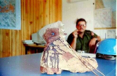Toen wij samen een keer in Sarajevo waren om spullen op te halen werd een collega van een andere groep (in Pale) beschoten toen hij met een vrouwelijke tolk op patrouille was. De kogels vlogen via de zijkant door zijn auto. Één daarvan ging door zijn laars en een paar anderen ketsten af tegen de versnellingskolom en vervolgden hun weg via de tolk. Zulke projectielen hebben vrijwel hetzelfde verschrikkelijke effect als de zogenaamde verboden dumdum kogels. Zij raakte dan ook ernstig gewond. Het is een beetje morbide (een vorm van verwerken of afreageren) want zijn maten staken een blauwe balpen («fig) door de laars om het kogelgat te markeren.
