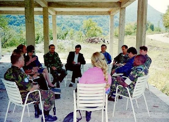 Discussie over de vraag of verder gaan naar Gorazde wel of niet verantwoord was. Rechts de delegatie op een berg in de enclave luisterend naar het verslag over de situatie toen dat gebied nog door de Servische eenheden bezet was. De militair in het midden was de officier logistiek (S4) van de moslimbrigade. In die tijd droegen de locale militairen een allegaartje aan uniformen. Ook veel burgers waren gedeeltelijk in een of ander uniform gekleed zodat de status van iemand niet altijd herkenbaar was.
