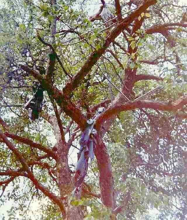 Behalve kleding in de boom zijn er van de inzittenden vrijwel geen overblijfselen meer te vinden.