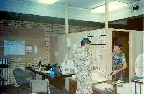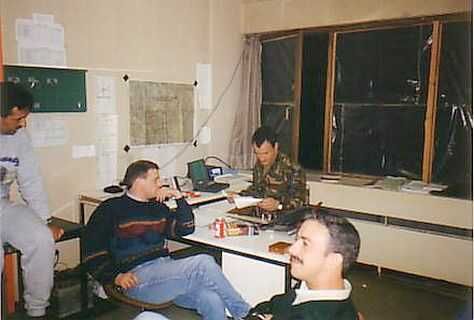 Het UNMO "office" in de "PTT building" in Sarajewo. Links mijn Egyptische en rechts mijn Argentijnse collega's beiden ook eerder geplaatst in Dubrovnic. |