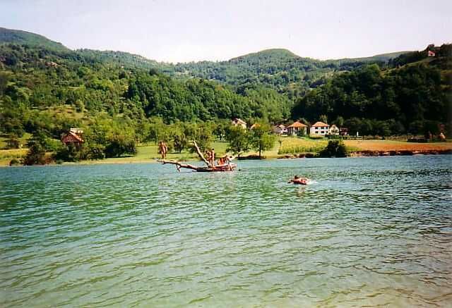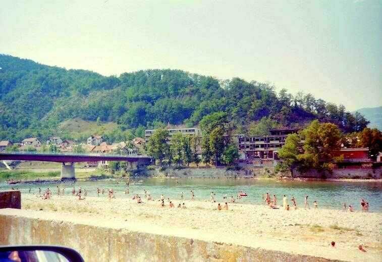 Toen de UNMO ploeg groter werd kon er meer tijd besteed worden aan de enige vorm van recreatie: zwemmen of hardlopen. De bewoners genoten massaal van het mooie weer door te zonnen op het strand aan de oevers van de Drina. Wij gaven de voorkeur aan een stroomafwaarts gelegen stiller plekje. Daar probeerden een vast groepje jongeren hun energie kwijt te raken op een "eilandje" midden in de stroom. Soms was er ook een redelijk goed Engels sprekende jonge vrouw die hier samen met Carlos een Colombiaanse UNMO op de foto staat. Zij had diverse niet levensbedreigende granaatsplinters in haar lichaam die vooralsnog niet operatief verwijderd werden. Er waren meer bewoners als "metaaldrager" omdat door gebrek aan medicijnen en ander geneeskundig materiaal de behandelende artsen een selectieve keus moesten maken.