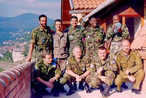 Een («fig) latere uitbreiding van de oorspronkelijke ploeg van 5 UNMO's gefotografeerd op het balkon. Het plan was om een groep aan de Servische kant te stationeren. Dat zou veel tijd en op en neer reizen besparen, maar ondanks veel overleg met de Serven, kreeg UNPROFOR het niet voor elkaar. Daarom was er voor zoveel UNMO's eigenlijk te weinig werk in de enclave.